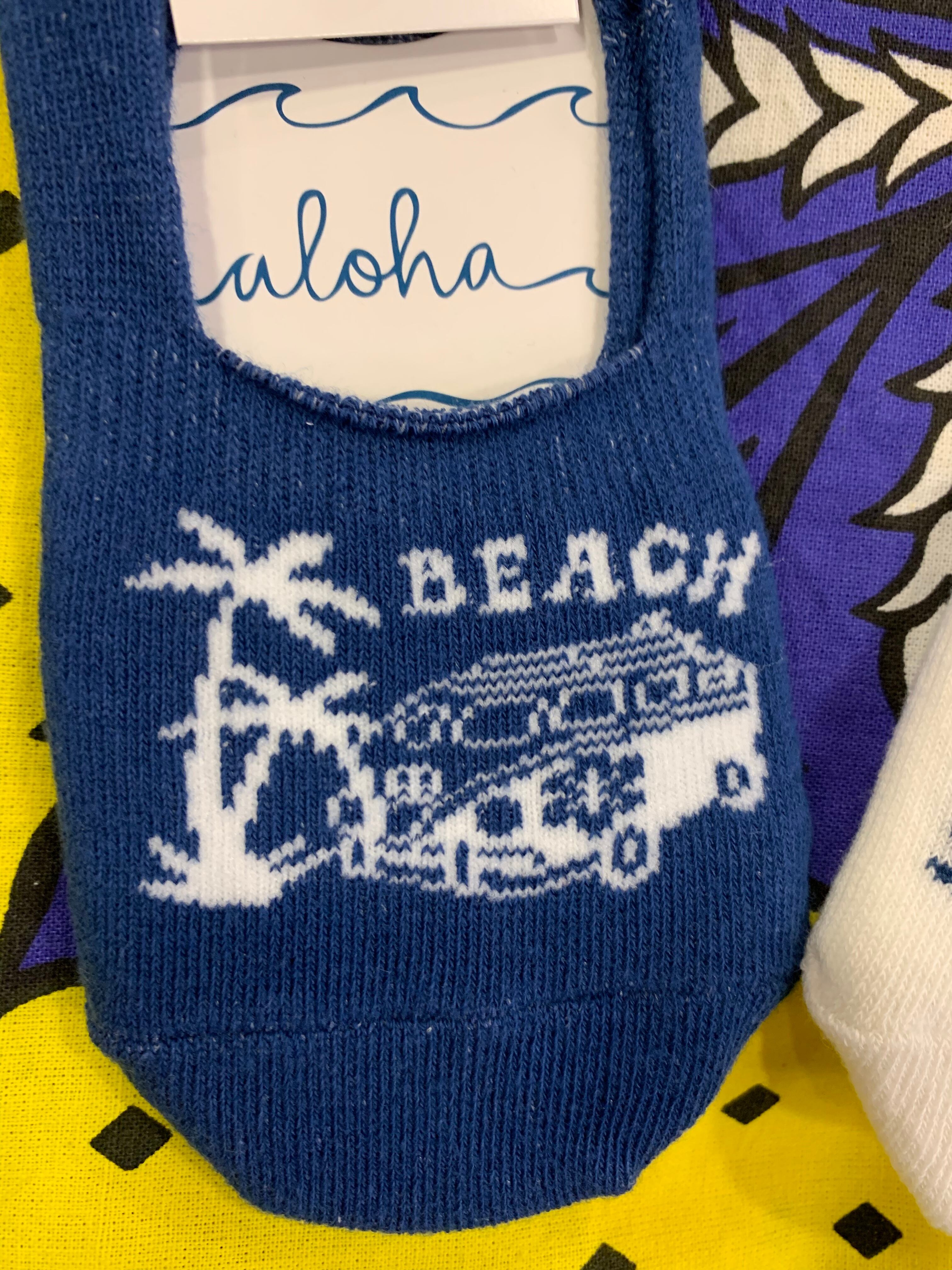 アロハの文字と波モチーフの柄がポイントのレディースソックス。浅いスニーカーを履いてもはみ出ない、便利な仕様。かかと部分にすべり止めが付いています